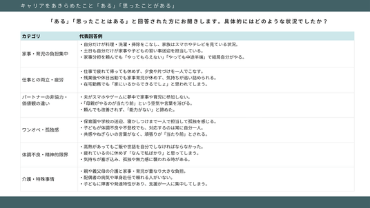 こうした「ワンオペ」や「非協力的なパートナーシップ」が、 働く女性のキャリア継続を阻む大きな要因となっています。