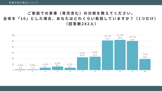 さらに、家庭内の家事・育児分担を「10段階中7~10」と答えた人が過半数を占め、 家事・育児の主な担い手が依然として女性に偏っている現実も明らかになりました。