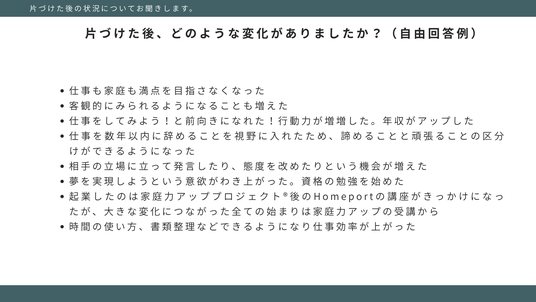 一方で、「家庭力アッププロジェクト(R)」を受講した人の中には、「仕事に前向きになれた」「新しい挑戦に踏み出した」「資格の勉強を始めた」「起業のきっかけになった」など、家庭を整える過程で自己効力感が高まり、キャリアの再スタートを切ったという声が多く寄せられています。