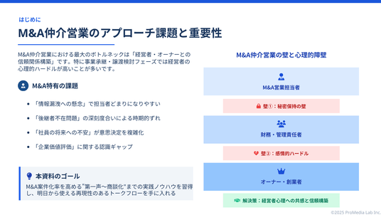 株式会社プロメディアラボ(本社:東京都中央区、代表取締役:廣瀬義憲)は、M&A営業における「経営者・オーナーアプローチ」の成功ノウハウをまとめた資料『経営者アプローチの極意 ~断られないM&Aヒアリングとオーナーとの信頼構築で成約率を最大化~』を公開しました。