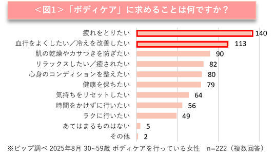 ピップの調査によると、ボディケアを行っている30~50代女性 222名のうち、63.1% がボディケアで「疲れを取りたい」と回答、さらに50.9%の人がボディケアで「血行や冷えを改善したい」と考えていることが分かりました<図1>。ボディケアは「綺麗に見せるため」に行うものという印象もありますが、半数以上の女性が外見だけでなく、身体の内側のケアを重視していることが判明しました。