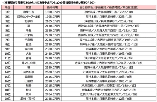 株式会社リクルート(本社:東京都千代田区、代表取締役社長:牛田 圭一、以下リクルート)が運営するニュースサイト『SUUMOジャーナル(スーモジャーナル)』は、住まいや暮らしに関するさまざまなテーマについて調査を実施し、結果をご紹介しています。今回は、「梅田駅まで30分圏内(近接駅から梅田駅に徒歩で行くルートも含める)」にある駅のうち、中古マンション(専有面積50平米以上~80平米未満)の価格相場が安い駅を調査しました。梅田駅には大阪メトロ御堂筋線が通っているほか、JR大阪駅、阪急電鉄と阪神電鉄の大阪梅田駅、大阪メトロの谷町線・東梅田駅と四つ橋線・西梅田駅、さらにはJR東西線の北新地駅が密集しています。梅田駅の中古マンションの価格相場8985万円に対し、価格相場が最も安かった京阪本線・寝屋川市駅は梅田駅の4分の1以下の1900万円でした。