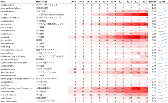 「MXene(マキシン:2次元ナノ材料の総称)」、「nanozymes(酵素模倣ナノ材料)」、「nanofluid(ナノ流体)」といったキーワードは、0.8以上の高い成長度をしめし、高頻度で出現しています。