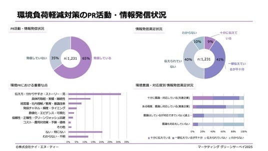 株式会社ケイ・エヌ・ティー(本社:東京都渋谷区)は、全国のマーケティング・広報担当者1,231名を対象に実施した「マーケティング グリーンサーベイ2025」の結果を発表しました。本調査では、 企業の環境対応における「実行」と「発信」の関係性を可視化し、環境施策の成熟度が高い企業ほど、活動の広がりと発信の整合性が連動する傾向が明らかになりました。一方で、発信の手応えは全体的に低調で、「信頼性の担保」を意識した取り組みは一部にとどまる結果となっています。環境対応の実践を可視化し、どのように社会的信用やブランド価値の向上へと結びつけていくか、が今後の焦点となります。