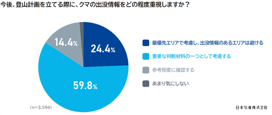 「最優先で考慮する」(24.4%)と「重要な判断材料とする」(59.8%)という回答が合わせて84.2%に上りました。これは、登山者にとってクマの出没情報が、欠かせない重要な判断材料になっていることを示しています。