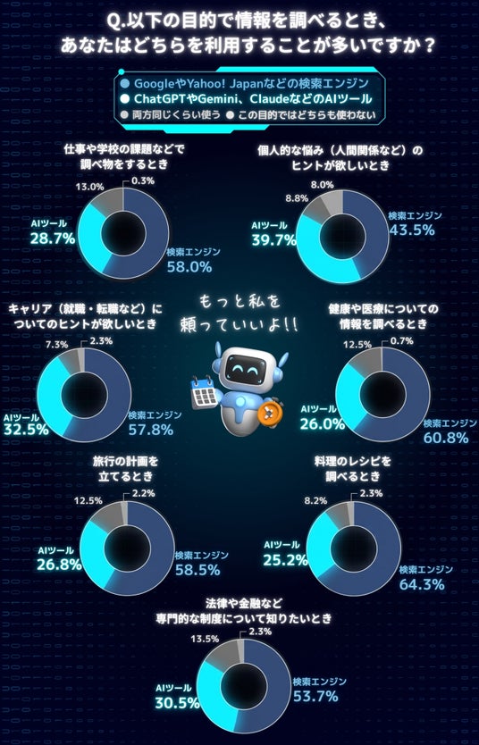 「以下の目的で情報を調べるとき、 あなたはどちらを利用することが多いですか?」と、7つの場面を想定した質問に対し、「検索エンジンを使う」「AIツールを使う」「両方同じくらい使う」「この目的ではどちらも使わない」の選択肢から回答していただきました。