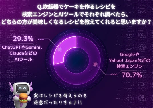 「炊飯器でケーキを作るレシピを 検索エンジンとAIツールでそれぞれ調べたら、 どちらの方が美味しくなるレシピを教えてくれると思いますか?」と質問したところ、「検索エンジン」と回答した方が70.7%を占める結果でした。対して、「AIツール」と回答した方は29.3%です。