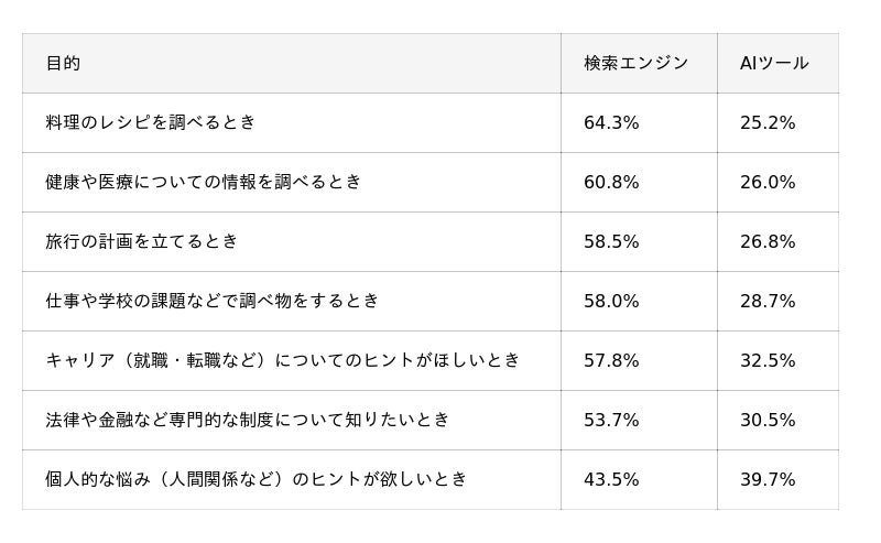 AIツールが普及しつつあるものの、「情報収集といえば『検索エンジン』」という認識の根強さが窺える結果でした。