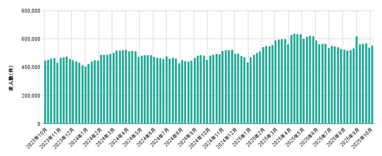■10月度の全国アルバイト・パート求人数は、554,001件(前月比-66,596件、前年同月比+69,886件)で前月から10.73%減少、前年同月から14.44%減少した。【図2】