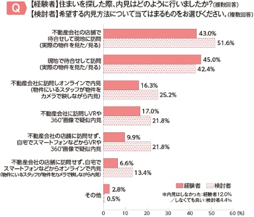 内見方法については、経験者は「現地で待合せして訪問」、検討者は「不動産会社の店舗で待合せして現地に訪問」がトップでした。