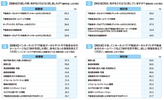 問い合わせた不動産会社の選定基準を聞くと、経験者は「住みたい地域に精通している」、検討者は「取り扱っている物件数が多い」がトップでした。また、検討者は「物件写真がきれいで見やすい」や「物件写真の枚数が多い」などインターネット上に公開されている写真を重視する人が多い傾向にありました。