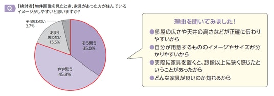 物件画像を見たとき、検討者の8割が「家具があった方が住んでいるイメージがしやすい」と答えました。理由を聞いたところ、「部屋の広さや天井の高さなどが正確に伝わりやすいから」、「実際に家具を置くと、想像以上に狭く感じたということがあったから」などがあがりました。