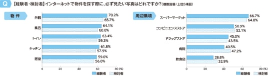 インターネットで物件を探した際に、必ず掲載してほしい物件の写真は、経験者・検討者ともに「外観」が1位で、特に経験者は70.2%でした。一方、周辺環境の写真は、経験者・検討者ともに「スーパーマーケット」がトップでした。