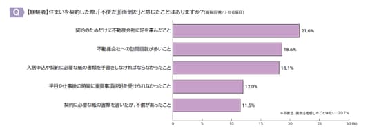 住まいを契約した際に「不便だ」「面倒だ」と感じたことを聞くと、1位は「契約のためだけに不動産会社に足を運んだこと」でした。