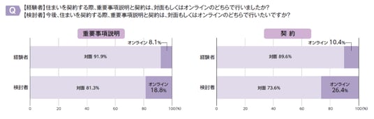 オンラインで重要事項説明・契約を経験した人はいずれも約1割に対し、検討者の約2割がオンラインを希望しました。