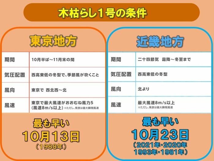 木枯らし1号の早い記録をみると、東京地方は10月13日(1988年)、近畿地方は10月23日(2021年・2020年・1993年・1981年)。