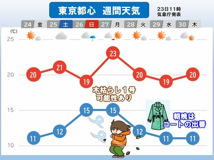 この先、26日(日)は列島を挟むように2つの低気圧が通過し、27日(月)は一時的に西高東低の冬型の気圧配置となり全国的に北風が強まる見込みだ。このタイミングで、東京と近畿で「木枯らし1号」が吹く可能性がある。