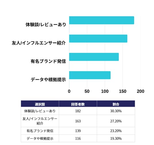 本調査では、Z世代が広告を信頼する要因として、「体験談/レビューあり」が30.3%で最も多く、次いで「友人/インフルエンサー紹介」(27.2%)、「有名ブランド発信」(23.2%)、「データや根拠提示」(19.3%)と続くことが明らかになりました。この結果は、Z世代が広告に対して「共感」と「信頼性」を重視する傾向が強いことを示唆しています。