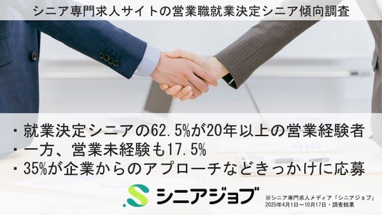 シニア転職支援の株式会社シニアジョブ(本社:東京都新宿区/代表取締役 中島康恵)は、運営するシニア専門求人サイト「シニアジョブ」を介して営業職に就業した求職者の傾向調査結果を発表しました。2025年4月1日から10月17日までの期間に、営業職に就業決定したうち、62.5%が20年以上の営業経験を持つシニアだったものの、未経験も17.5%と少なくなく、また、企業側からがオファー(スカウト)やカジュアル面談を行い採用に至ったケースが35%に達するなど、人手不足解消のための企業の努力を垣間見ることができる結果となりました。
