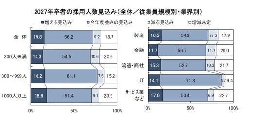 採用数「増える見込み」が15.8 %で、「減る」(9.2%)を上回る。採用予算も増加傾向
