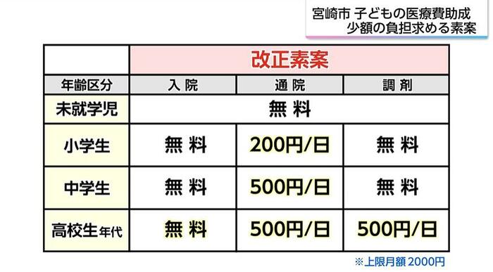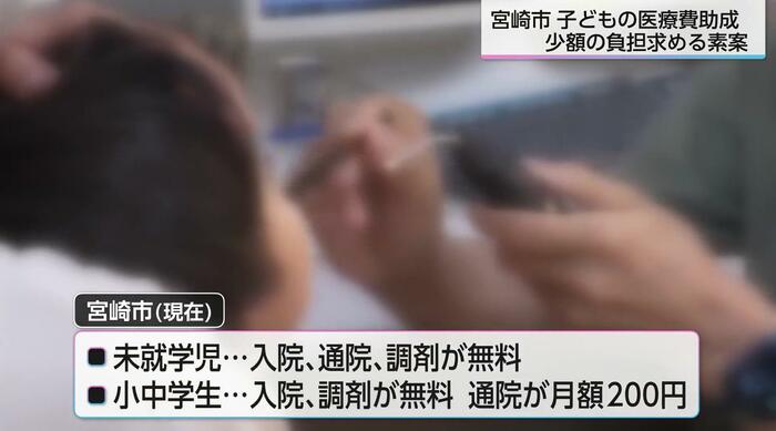 宮崎市では現在、未就学児は「入院」「通院」「調剤」が無料で、小中学生は「入院」「調剤」無料、「通院」は1医療機関あたり「月額200円」とする助成が行われている。しかし、不要な受診や過度な抗菌薬の処方などが問題となっていて、制度の見直しが進められてきた。