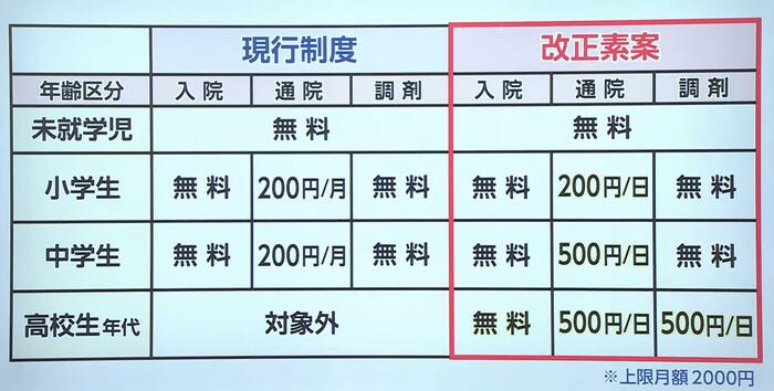 10月の市長定例会見で示された素案では、助成の対象年齢が高校生まで拡大され、「入院」が無料、「通院」「調剤」が1医療機関あたり「日額500円」となる。