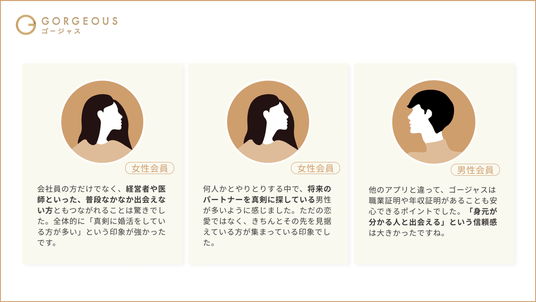 2022年10月サービスリリース。ゴージャスは、理想のお相手と出会いたいと考える男女をターゲットとした、「あなたにふさわしい、ハイクラスな出会い」を実現する完全審査制の恋活・婚活マッチングアプリです。 ゴージャスは、AIを用いた独自の審査を通過した会員のみが利用可能です。ハイクラスな出会いをご提供するため、あなたにふさわしいお相手を毎日ピックアップ。「ゴージャス」ブランドコンセプト