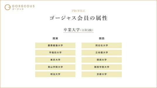 - 出身大学を見ると、関東エリアでは慶應義塾大学、早稲田大学、東京大学、関西エリアでは同志社大学、立命館大学、関西大学が上位を占め、いずれの地域も主要大学出身者が多く、ハイクラスな会員が集っているようです。