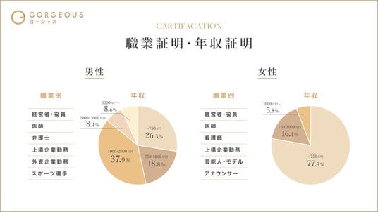 - 一方、女性会員も2025年2月より職業証明・年収証明が可能となり、年収証明済み会員のうち22.2%が年収750万円以上、5.8%が年収1,000万円以上という結果に。なお、年収1,000万円以上の女性は、日本国内でわずか上位1.1%(※)にあたる希少な存在であり、男女ともに高い信頼基準を満たす会員層が形成されています。