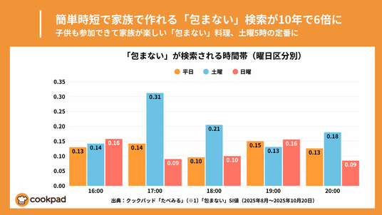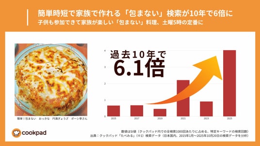 利用者数No.1レシピサービス「クックパッド」を運営するクックパッド株式会社は、「包まないシュウマイ」「包まない餃子」などの「包まない」レシピの検索動向を調査しました。2015年から2025年の10年間で検索が約6.1倍に増加し(※1)、特に土曜日の17時にピークを迎えています。共働き家庭が時間に追われる中でも、週末は「家族で一緒に作ることができる食事」を求めている実態が表れています。