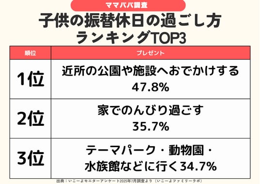 学校・園行事による振替休日の過ごし方の調査を行ったところ、「近所の公園や施設へおでかけする」(47.8%)が最も多く、次いで「家でのんびり過ごす」(35.7%)という結果になりました。詳しいデータをチェック!
