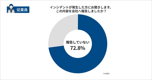 不審な電話や詐欺メール・SMSによる被害や被害未遂などのインシデントを経験した従業員に対し「この内容を会社へ報告しましたか」と尋ねたところ、72.8%が「報告していない」と回答しました。