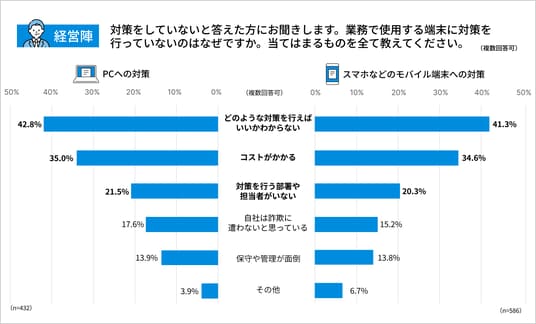 サイバー犯罪や詐欺への対策を行っていない理由としては、PC・スマホなどのモバイル端末いずれも「どのような対策を行えばいいかわからない」「コストがかかる」が多く挙がっています。