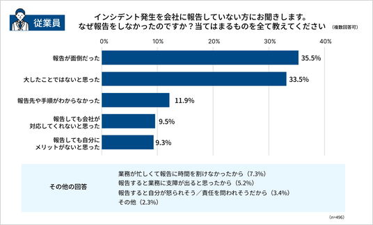 その理由は「報告が面倒だったから」が最も多く、次いで多かったのが「大したことではないと思った」が続き、被害を軽視する意識がうかがえます。