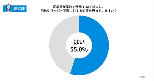 企業の経営陣に「従業員が業務で使用するPCに、詐欺やサイバー犯罪に対する対策を行っていますか」を尋ねたところ、全体の55%が「はい」と回答しました。