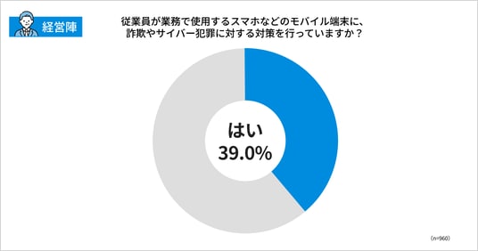 スマホなどのモバイル端末に対する対策はさらに手薄で、自社で対策を行っていると答えた経営陣は39%にとどまりました。