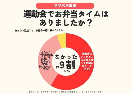 合計すると、家族でお弁当を一緒に食べる時間がなかったという回答が94.7%にのぼり、従来の運動会で定番だった「家族団らんのお弁当タイム」は(5.3%)という回答結果となりました。