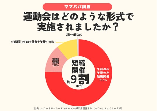 運動会の開催形式について尋ねたところ、75.5%が「午前のみ・午後のみ短縮開催」と回答し、従来の終日開催から大きく変化していることが明らかになりました。