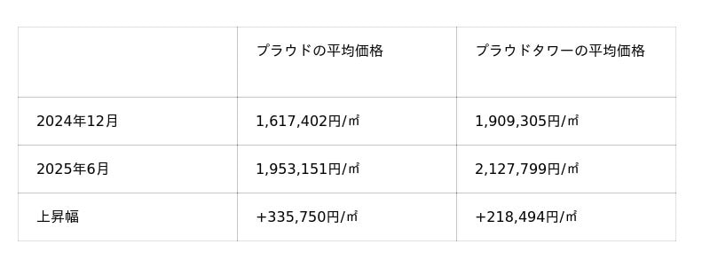 2024年12月と2025年6月比較 プラウド・プラウドタワー平均価格(2025年10月マンションナビ調べ)