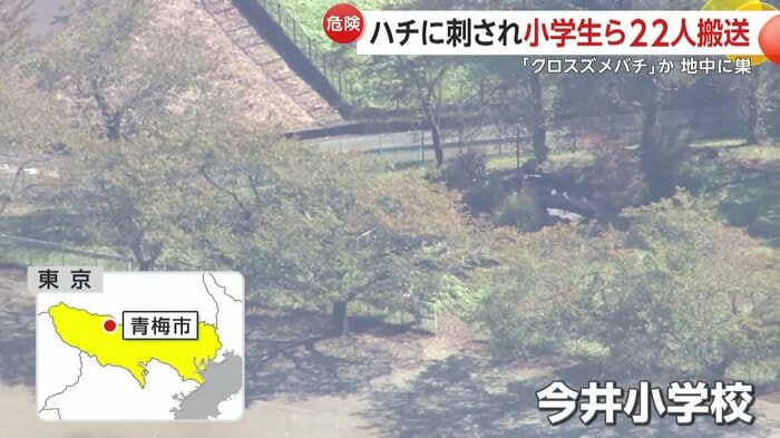 東京・青梅市の小学校で23日午前、小学1年生の児童ら22人がハチに刺され、病院に搬送された。全員意識はあるという。