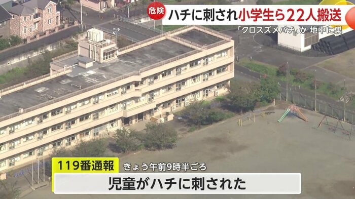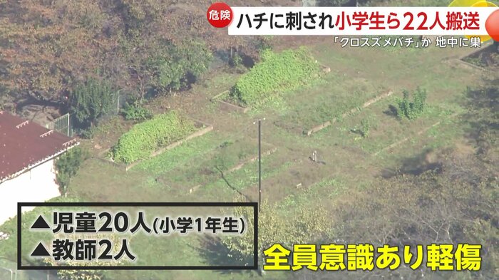 小学1年生の児童20人と担任の教師2人がハチに刺され、病院に搬送。全員意識があり、軽傷だという。
