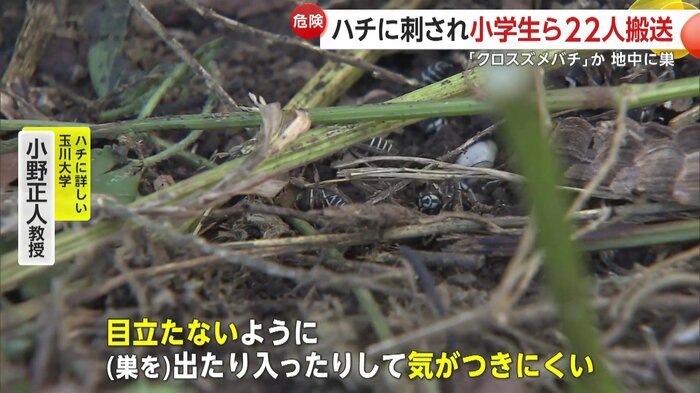 通常ハチは、ぶんぶんぶんぶん飛んでいるわけではなくて、目立たないように(巣を)出たり入ったりして気がつきにくい。人が外から見えない土の中に巣ができるっていう種もいるっていうことを考えて、これから秋の校外学習などについては、取り組む必要がある。