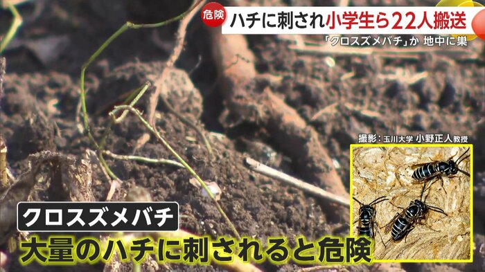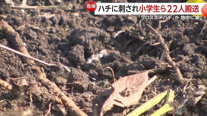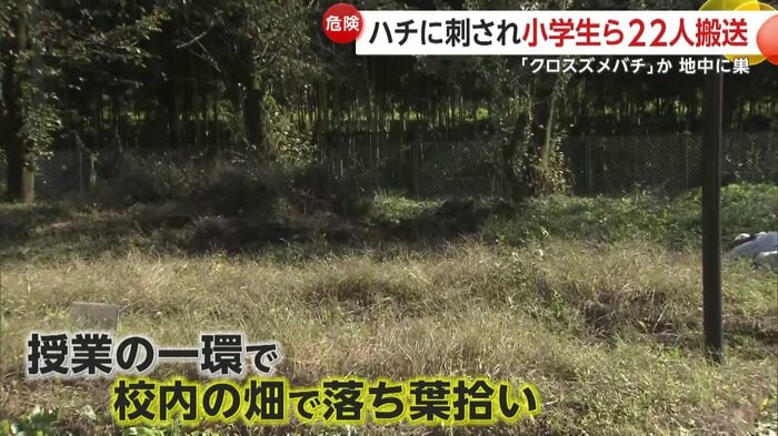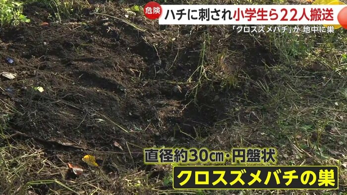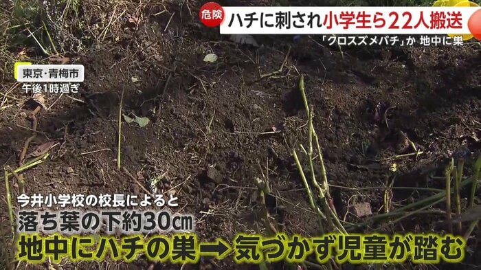 校長によると、落ち葉の下30cmくらいの土の中にハチの巣があったといい、それに気づかず、児童が踏んでしまったという。