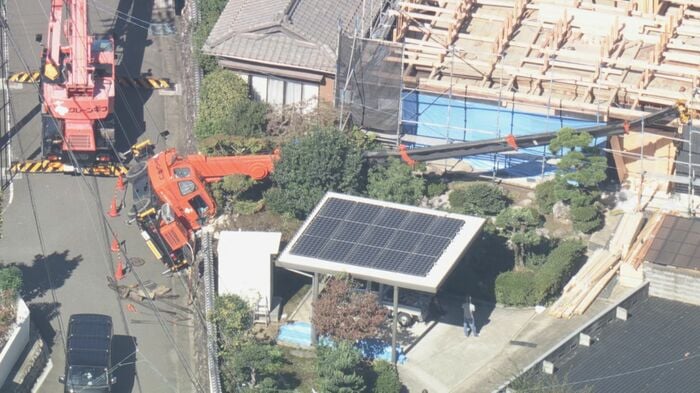 現場では住宅のリフォーム工事が行われていて、倒れたクレーンのアーム部分などが屋根や壁などに衝突しましたが、けが人はいないということです。