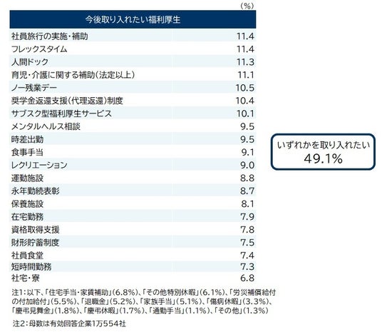 今後いずれかの福利厚生を取り入れたい企業は約半数、「社員旅行」「フレックスタイム」がトップ