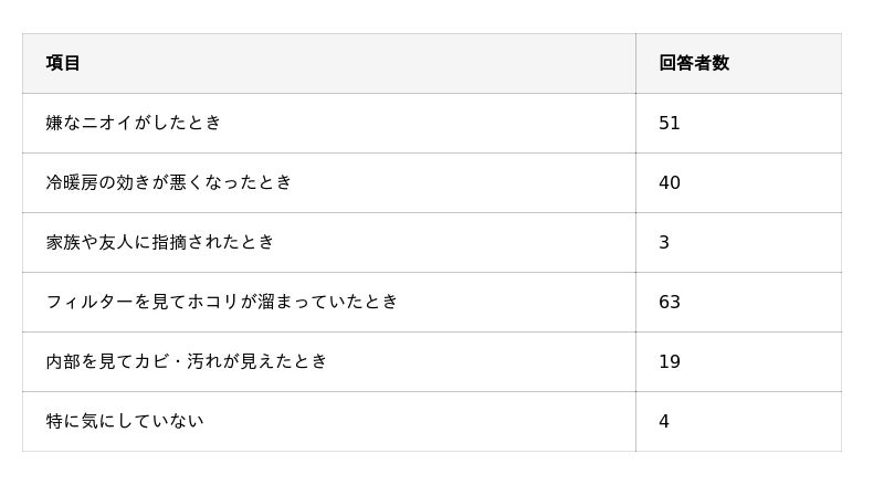 ・エアコンの汚れに気づくタイミングは「フィルターを見てホコリが溜まっていたとき」で、普段の使用の中では「嫌なニオイがしたとき」。