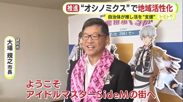 袋井市では11月1日からアニメ・アイドルマスターSideMに登場するユニットとのコラボが実現し、市のキャラクター・フッピーをイメージした衣装を着たメンバーのグッズを市内で販売することになっていて、大場規之 市長は「SideMやアイドルマスターファンはかなりいるので、そうした人たちに袋井に来てもらうことの経済効果や様々なイベントを通して、ファンが市とのつながりを深めていくことを期待している」と狙いを打ち明ける。