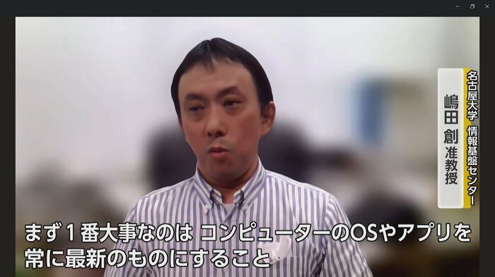 「まず1番大事なのはコンピューターのOSやアプリを常に最新のものにすること。事前にコンピューターの中のデータを定期的にバックアップをとる。万が一ランサムウェアに罹ってしまったら、とっておいたバックアップのデータを書き戻して復旧する。自分に起こるかもしれないと常に意識して気を付ける」(嶋田准教授)