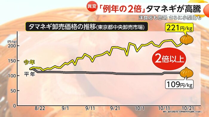 タマネギの卸売価格は、8月22日から10月21日の2カ月でぐんぐん上昇し、例年の2倍以上となっている。