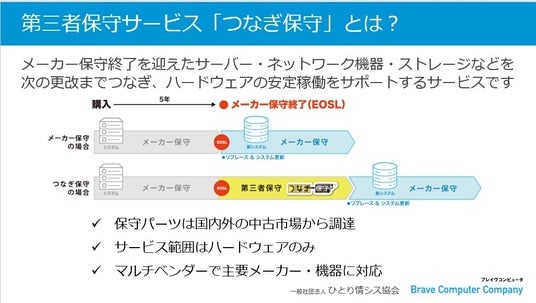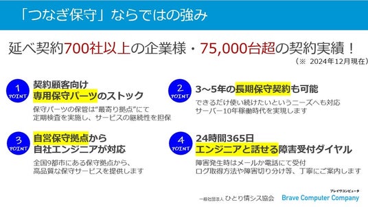 今回の取り組みをきっかけに、当社の第三者保守サービス「つなぎ保守」は協会の認定ソリューションとしていただく運びになりました。今後も、ブレイヴコンピュータは「つなぎ保守」を通じて、企業のITコストの有効利用や計画的なシステム更新を支援して参ります。